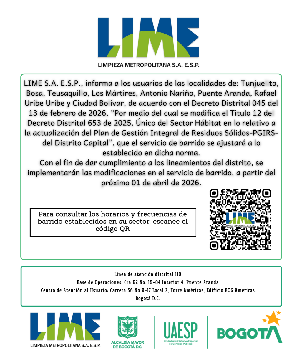 Recolección domiciliaria, recolección de escombros, recolección del producto de barrido, barrido manual y mecánico, limpieza y lavado de áreas públicas, lavado de puentes peatonales y vehiculares, corte de césped, poda de árboles, contenerización, instalación y mantenimiento de cestas públicas, gestión comercial y financiera.